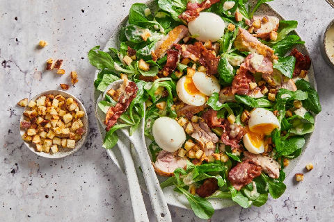 Salade doucette, lardons et croûtons