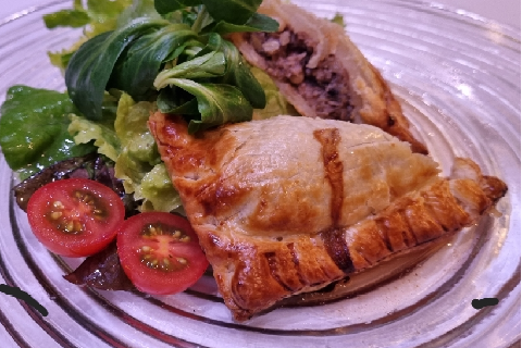 Petit pâté chaud de gibier et buisson de salades au verjus