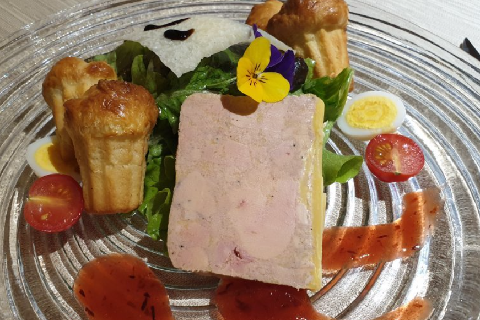 Terrine de foie gras, marmelade aux bérudges de Cressier, brioche maison