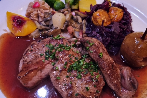 Galantine de faisan aux bolets et foie gras, tartine à la confiture d'oignons rouges et raisins **** Civet de chevreuil "Chasseur", fricassée de champignons des bois et fins lardons, spätzli maison au beurre, chou rouge braisé aux marrons **** Tarte au potiron